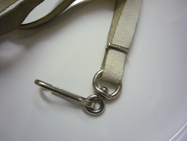 Ledergurt weiß , breit 1,6 cm, maximale Länge 62 cm, Karabinerhaken