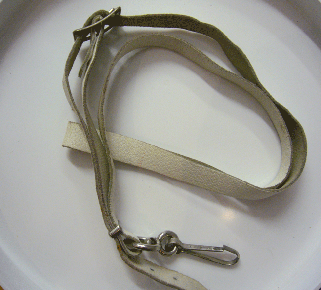 Ledergurt weiß , breit 1,6 cm, maximale Länge 62 cm, Karabinerhaken